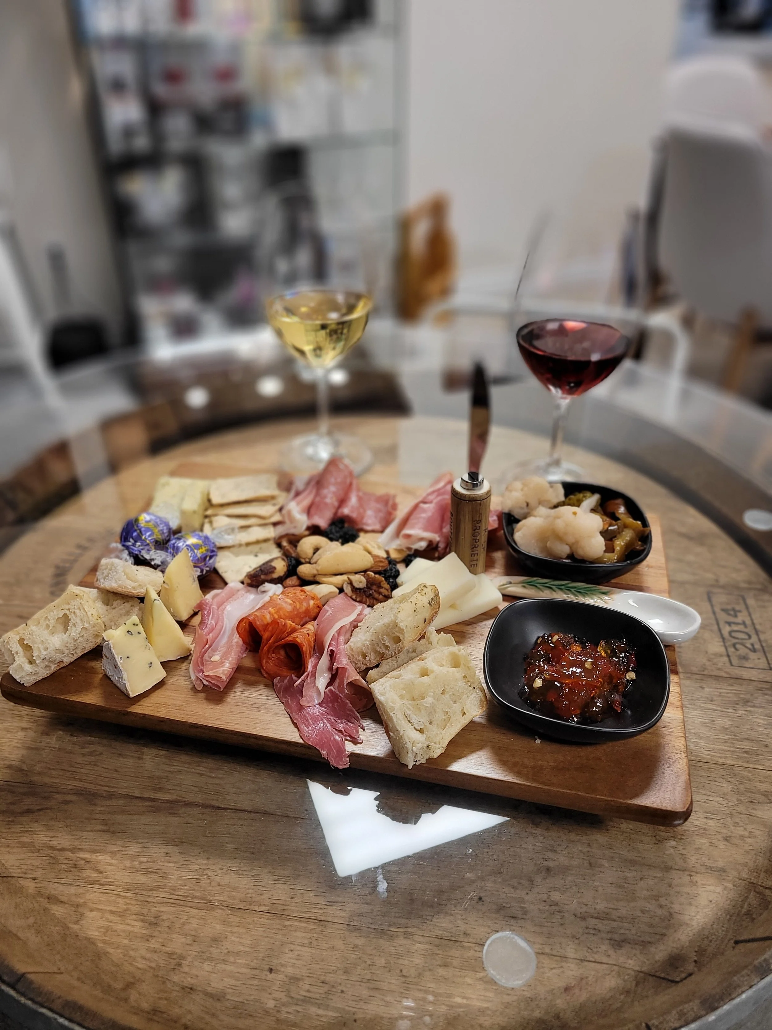An assortment of cured meats, fine cheeses, fruit, nuts, pickles, pepper jelly crackers/bread