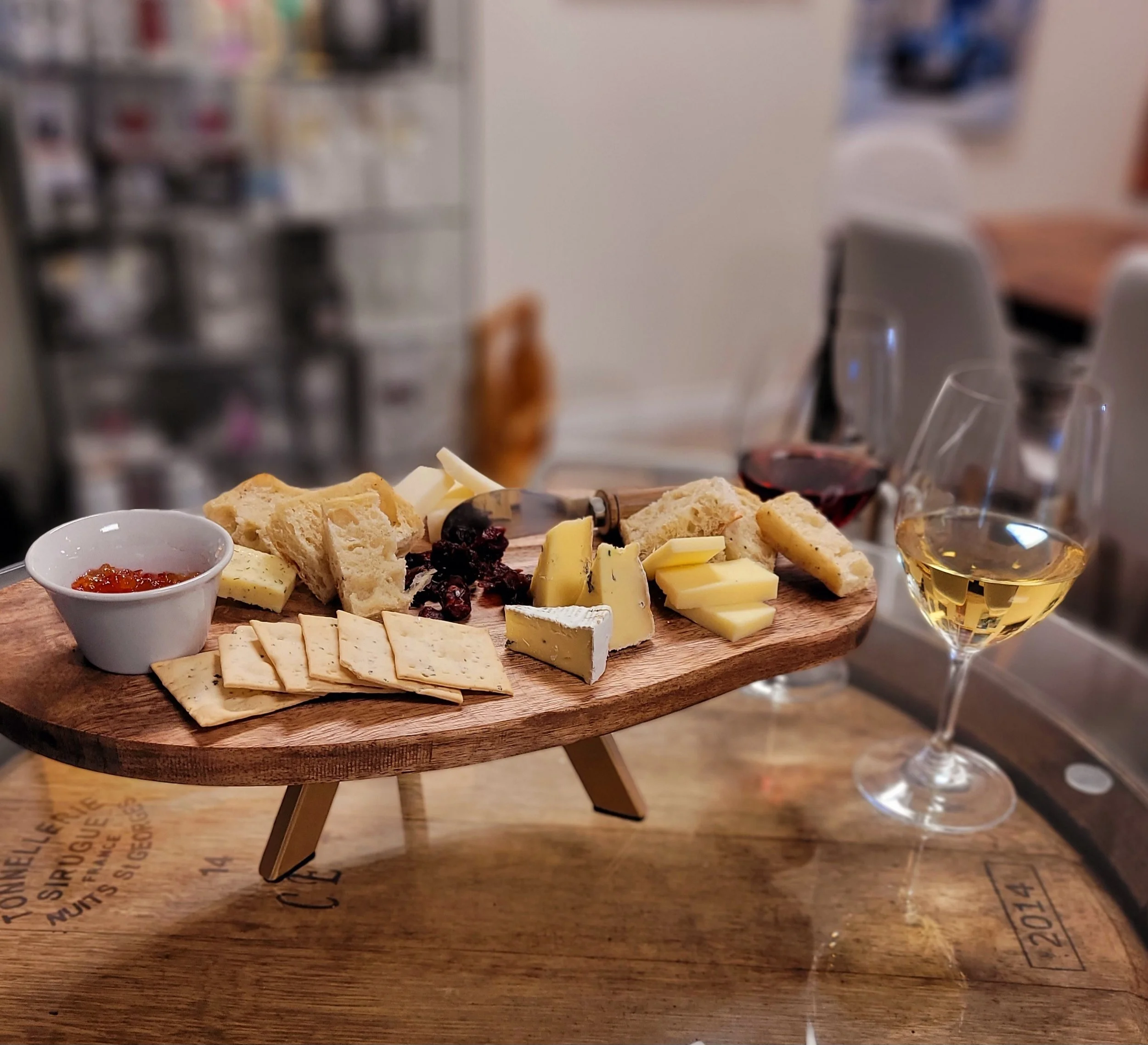 An assortment of cheeses, pepper jelly, fresh fruit, crackers and focaccia.